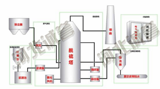 石灰石-石膏法脫硫在電廠鍋爐、供暖鍋爐等工業鍋爐窯爐煙氣治理方面是應用較為廣泛的一種脫硫工藝,該工藝采用石灰石作脫硫吸收劑,吸收劑與水混合攪拌制成石灰石漿液。在脫硫塔內,石灰石漿液與煙氣接觸混合,煙氣中的SO2與漿液中的碳酸鈣以及鼓入的氧化空氣進行化學反應,SO2被脫除,反應產物為石膏。脫硫石膏漿經脫水裝置脫水后回收。